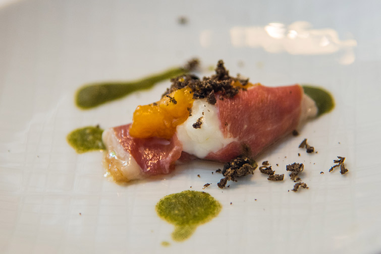 Comporre il piatto mettendo nella fettina di prosciutto d’oca la salsa al limone, chiudendo e porvi sopra la percoca d una grattatina di tartufo scorzone.