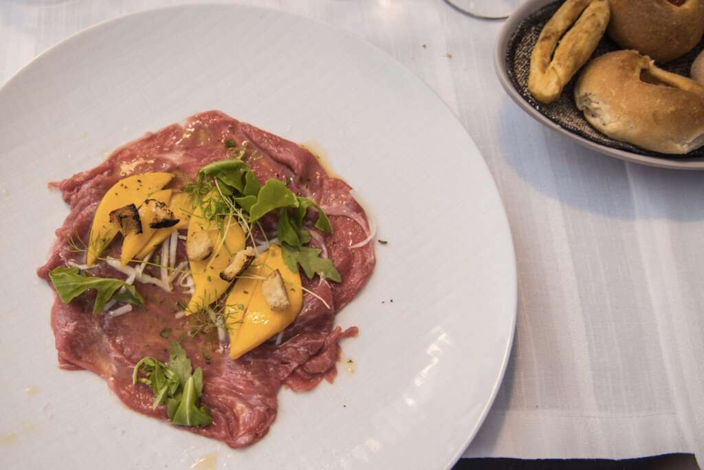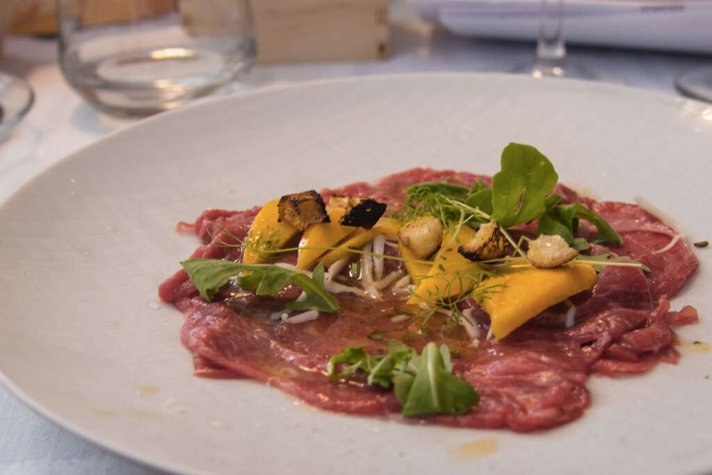Carpaccio di puledro, pan bruciato,percoca osmotizzata al limone, erbetta di carota