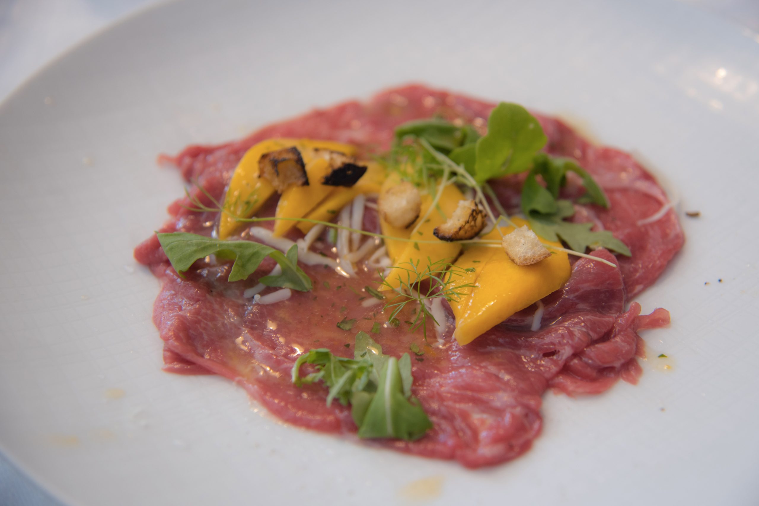 Ingredienti per 1 piatto Carpaccio di puledro, pan bruciato,percoca osmotizzata...