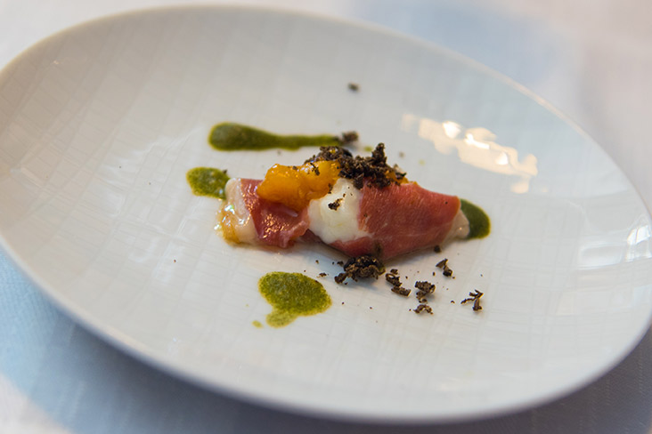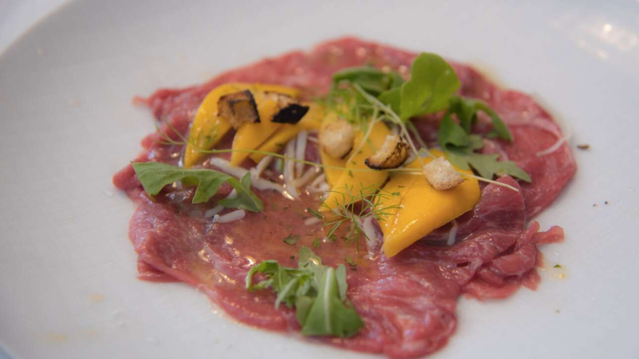 Carpaccio di puledro, pan bruciato,percoca osmotizzata al limone, erbetta di carota