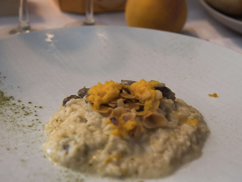 Risotto carnaroli S.andrea 1929 GOIO, polpa di maialino di norcia, mandorle e percoca