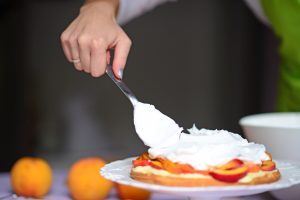 Prendete i due dischi di pan di Spagna, ponete sul primo uno strato di pesche e ricopritelo prima con la vostra crema pasticcera (fredda) e poi aggiungete uno strato di panna. Coprite con il secondo disco di pan di Spagna e ricoprite quest’ultimo con la restante panna, le pesche e su queste ultime spruzzate la gelatina spry per conservarle più a lungo.